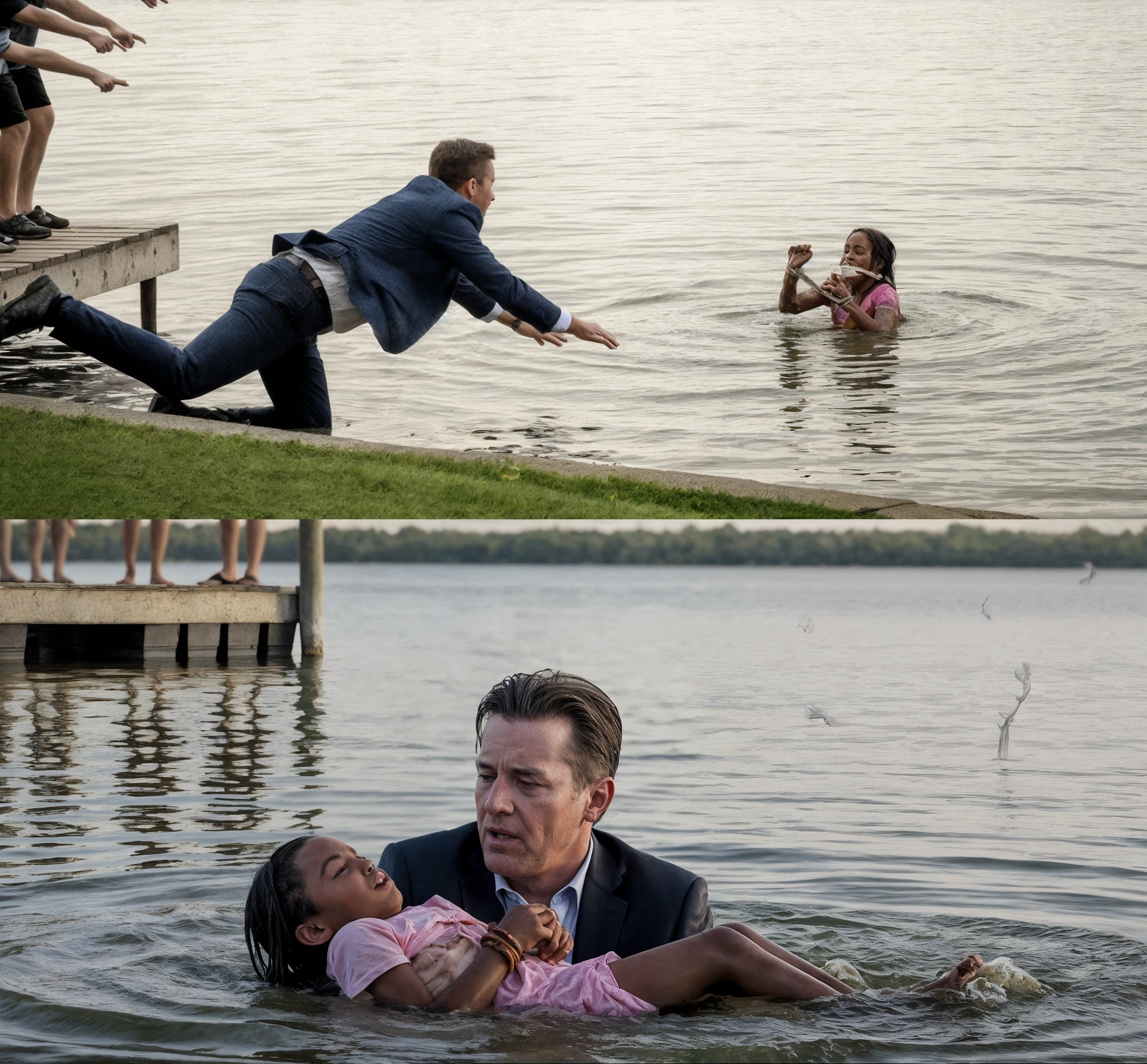 David non esitò. Si strappò la giacca di dosso e si tuffò dritto nel lago. Il freddo gli serrò i polmoni, ma l’adrenalina lo spinse avanti. Tagliò l’acqua raggiungendo la bambina proprio mentre scivolava sotto la superficie. Le passò un braccio attorno alla vita, la tirò su e scalciò forte verso riva. Quando riemersero, lei ansimò debolmente, l’acqua le strozzava la voce. David le tenne la testa fuori, mormorando: «Ti ho presa, tesoro. Ti ho presa.»