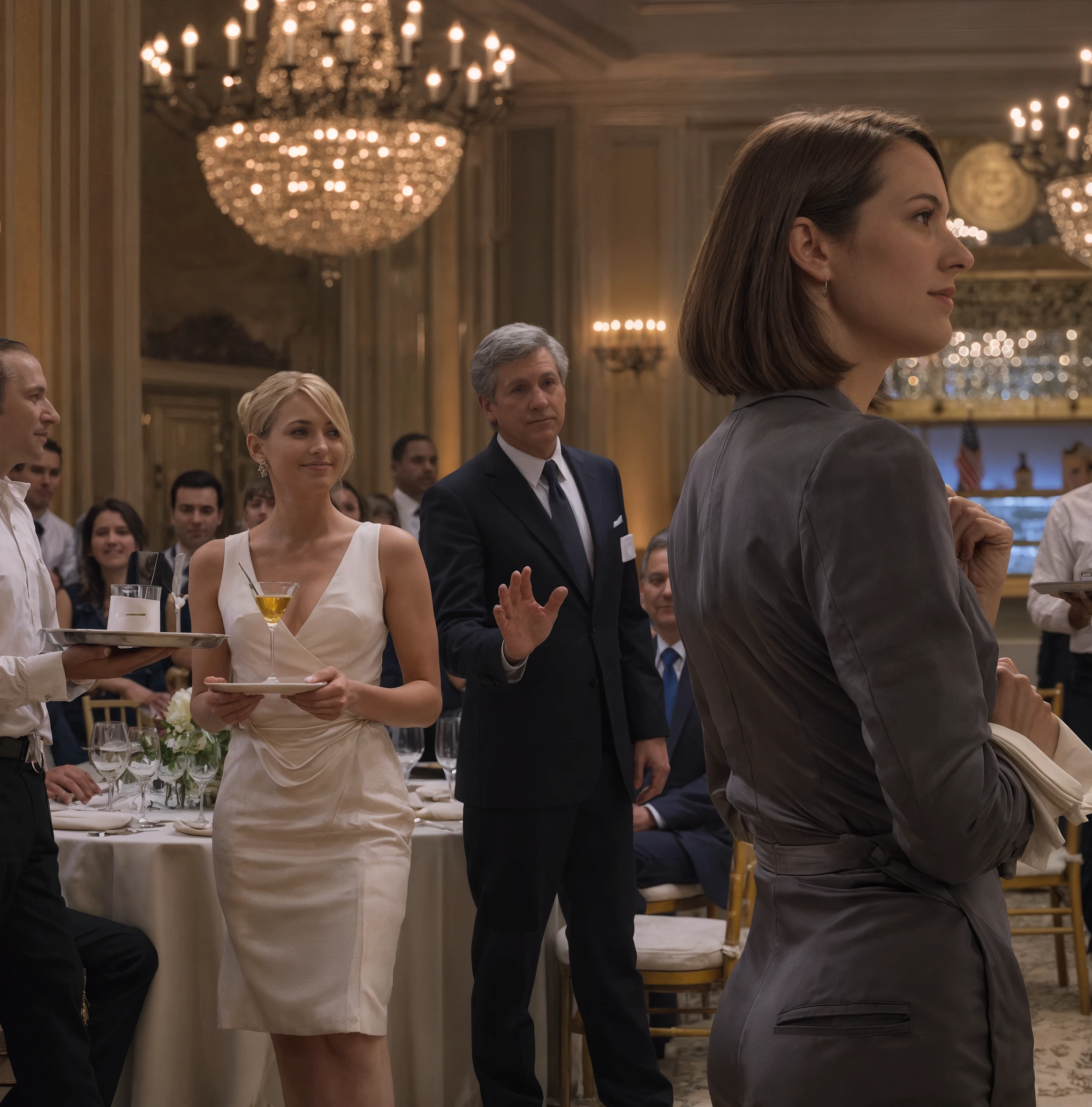 Alle 19:15 iniziò il servizio cena. Il servizio di alto livello è un balletto. Un passo falso e l’illusione si incrina. Vidi Maria—housekeeping, quella a cui avevo fatto curare il ginocchio—aiutare la squadra banchetti perché eravamo sotto organico. Portava un vassoio di flûte vuoti.