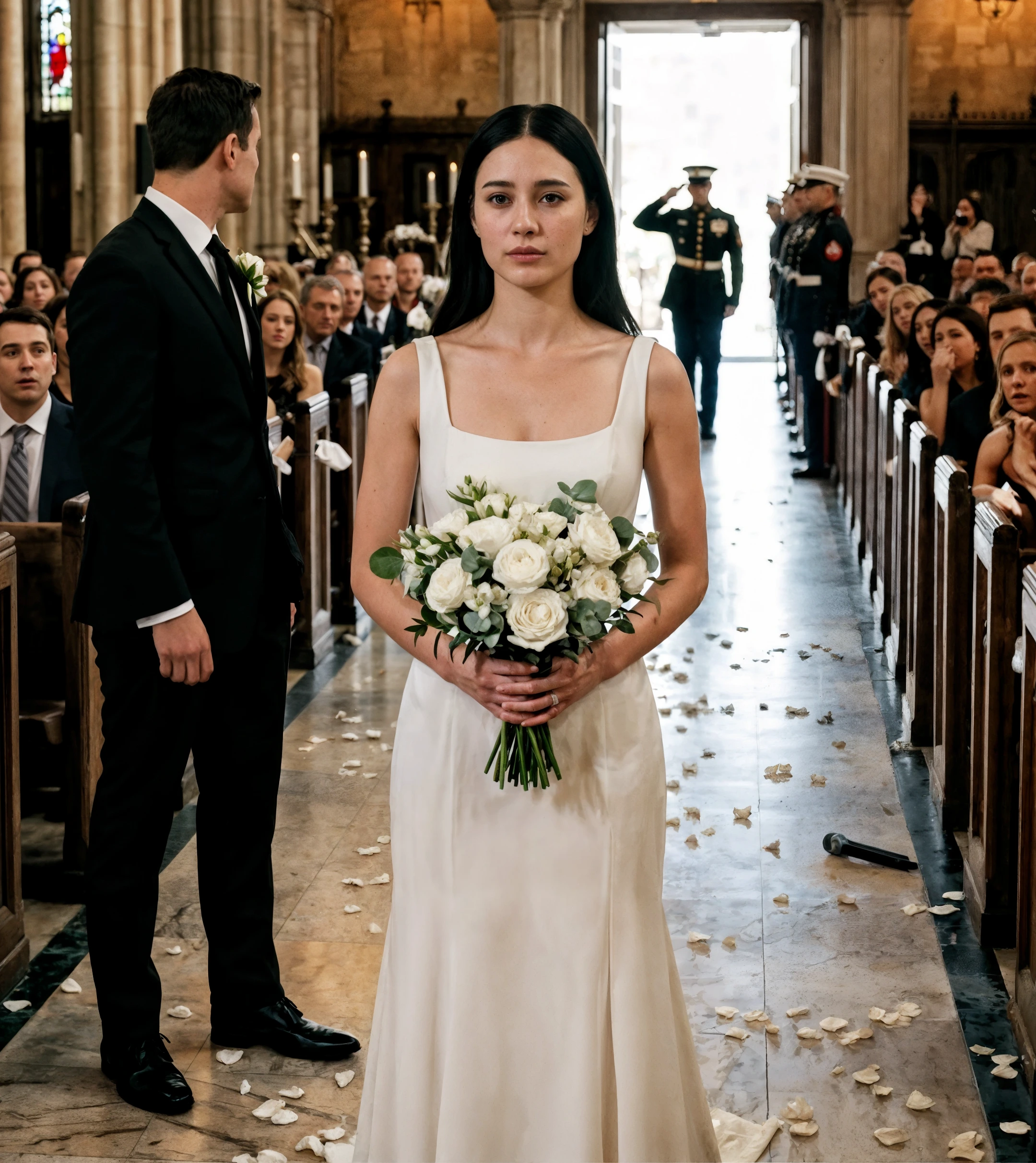 Lui lasciò cadere il microfono e disse: «Non posso sposare una nullità come te» — e mentre la chiesa rideva della sposa che pensava sarebbe rimasta in silenzio, il primo SUV nero entrò sul prato, verità sepolte iniziarono a riemergere alla luce, e la donna con l’abito bianco semplice finalmente alzò lo sguardo come se avesse aspettato questo momento per tutto il tempo